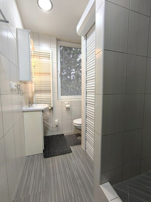 -vstupná chodba, kúpeľňa s toaletou a sprchovým kútom, kuchyňa, izba, balkón + pivnica